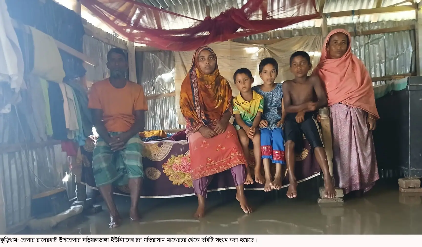 পাশেই চার/পাঁচটি বাড়ির পরেই সাবিনাদের বাড়ি। তাদের শোবার ঘরে পানি প্রবেশ করেছে। দুসন্তান আর মাকে নিয়ে বিছানায় অবস্থান নিয়েছেন তারা। সাবিনা জানান, রাত থেকে পানি বাড়ার ফলে ঘরের ভিতর পানি ঢুকেছে। ফলে রান্নার কষ্ট হচ্ছে। গরু-ছাগল, হাঁস-মুরগী, বাচ্চাদের নিয়ে খুব বিপদে আছি।