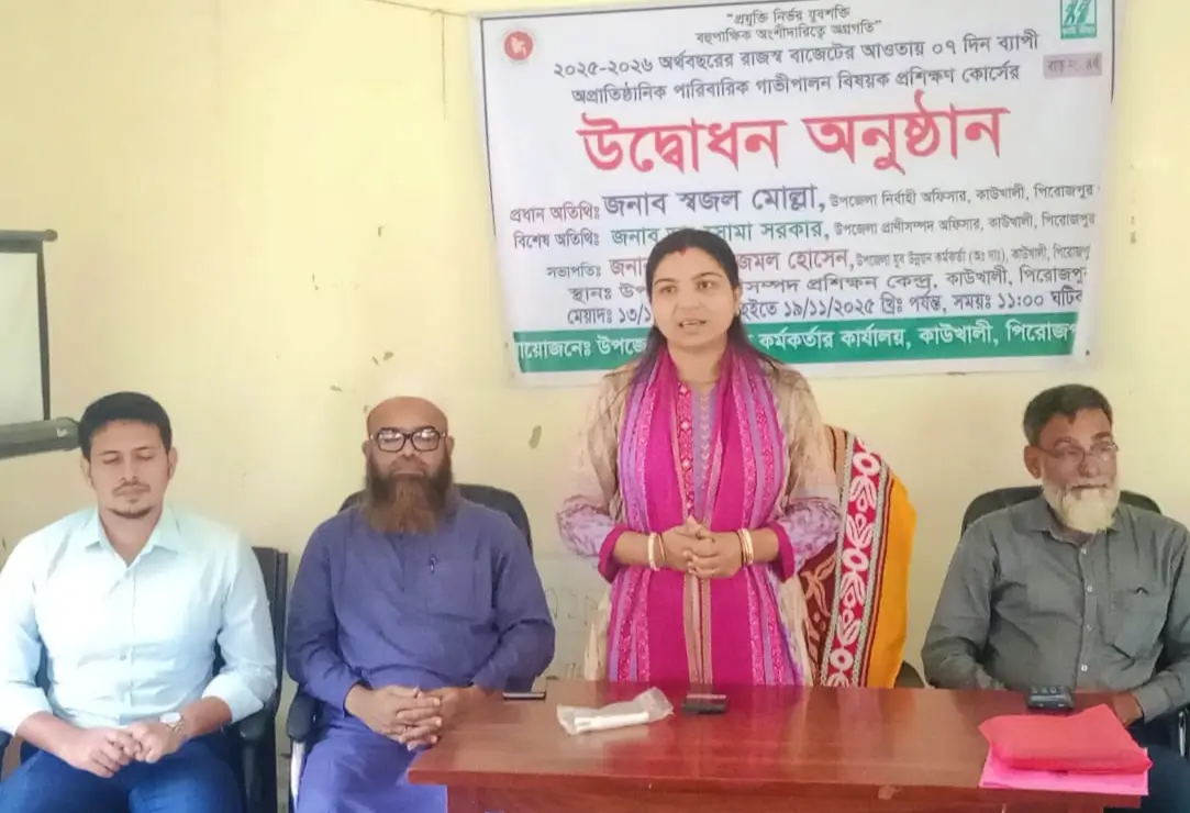 পিরোজপুরের কাউখালীতে বৃহস্পতিবার (১৩ নভেম্বর) বেলা সাড়ে এগারোটায় যুব উন্নয়ন অধিদপ্তরের আয়োজনে, কাউখালী উপজেলা প্রাণী সম্পদ প্রশিক্ষণ কেন্দ্রে ২০২৫/২৬ অর্থ বছরে রাজস্ব বাজেটের আওতায় ৭ দিনব্যাপী অপ্রাতিষ্ঠানিক পারিবারিক গাভী পালন বিষয়ক প্রশিক্ষণ কোর্সের উদ্বোধন করেন, কাউখালী উপজেলা নির্বাহী অফিসার স্বজল মোল্লা।