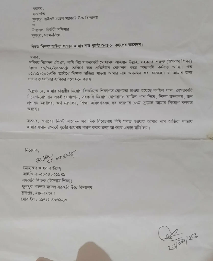 তবে ২০২৫ সালের ১ সেপ্টেম্বর শিক্ষক হাজিরা খাতায় তাঁর নাম অবনমন করা হয়, যা একজন শিক্ষকের সম্মান ও মর্যাদার পরিপন্থী এবং অমানবিক আচরণের শামিল বলে মনে করছেন অনেকে।