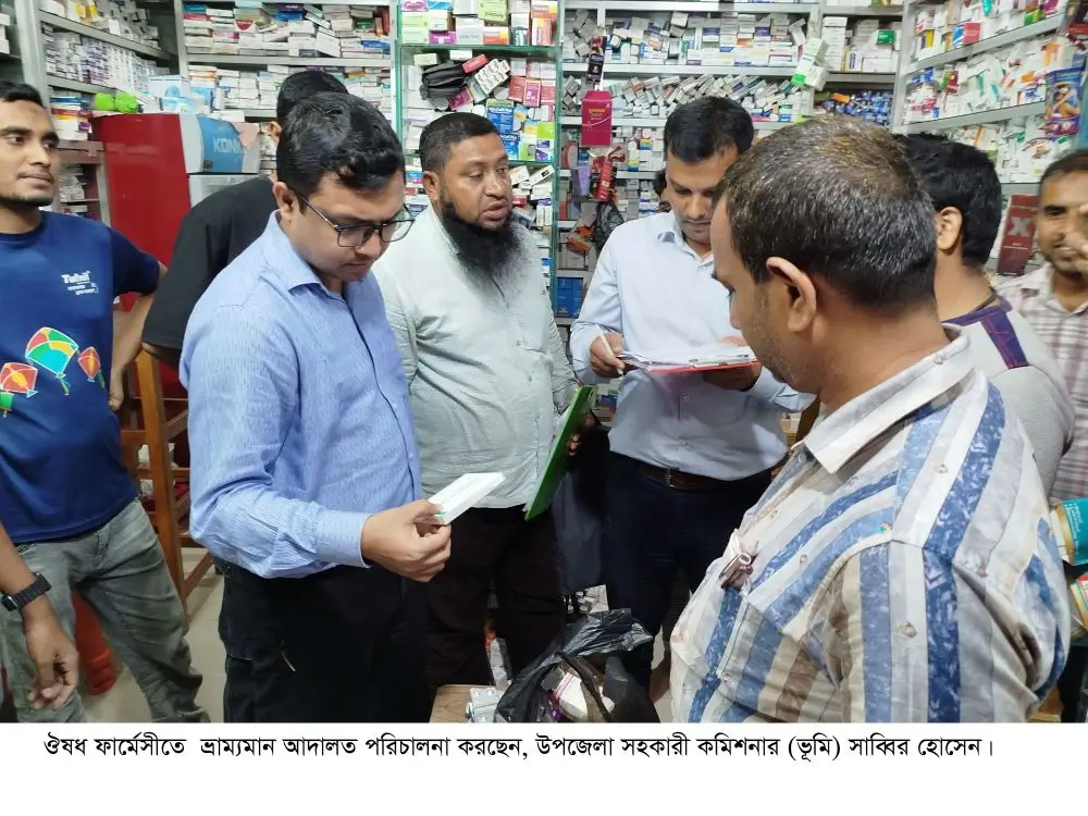 নির্বাহী ম্যাজিষ্ট্রেট সাব্বির হোসেন জানান, অভিযান পরিচালনা কালে ফার্মেসীগুলোত মেয়াদ উত্তীর্ণ ঔষধ, ফিজিশিয়ান স্যাম্পল, ব্যাবস্থাপত্র ছাড়া এন্টিবায়োটিক বিক্রিসহ নানা অনিয়ম দেখা যায়। এতে ঔষক ও কসমেটিক্স ২০২৩ আইন অনুযায়ী ৫ টি মামলা দায়ের পূর্বক জরিমানা আরেপ করা হয়।