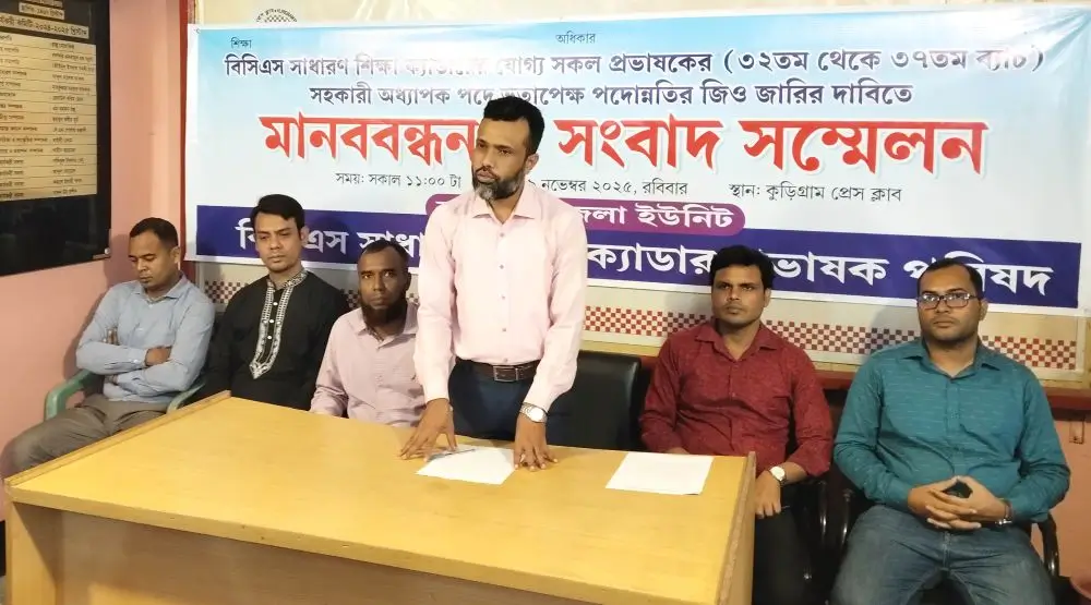 রবিবার (৯ নভেম্বর) সকাল ১১টায় কুড়িগ্রাম প্রেস ক্লাব প্রাঙ্গণে এই মানববন্ধন ও সংবাদ সম্মেলনের আয়োজন করে বিসিএস সাধারণ শিক্ষা ক্যাডার প্রভাষক পরিষদ, কুড়িগ্রাম জেলা ইউনিট।