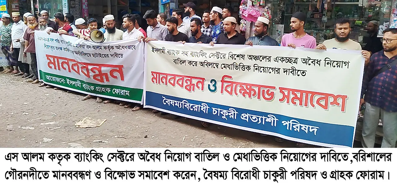 দেশব্যাপী ইসলামী ব্যাংক সহ ব্যাংকিং সেক্টরে বিশেষ অঞ্চলের একচ্ছত্র অবৈধ নিয়োগ বাতিল করে অবিলম্বে মেধাভিত্তিক নিয়োগের দাবি ও ২০১৭ থেকে ২০১২৪ সাল পর্যন্ত ব্যাংক লুটেরা, মাফিয়া এস আলম কতৃক অবৈধভাবে নিয়োগকৃত অদক্ষ কর্মকর্তাদের অনতিবিলম্বে ছাটাইয়ের দাবীতে বরিশালের গৌরনদীতে মানববন্ধন ও বিক্ষোভ সমাবেশ অনুষ্ঠিত হয়। বৈষম্যবিরোধী চাকুরী প্রত্যশি পরিষদ ও ইসলামী ব্যাংক গ্রাহক ফোরামের উদ্যোগে এ মানববন্ধন অনুষ্ঠিত হয়েছে।