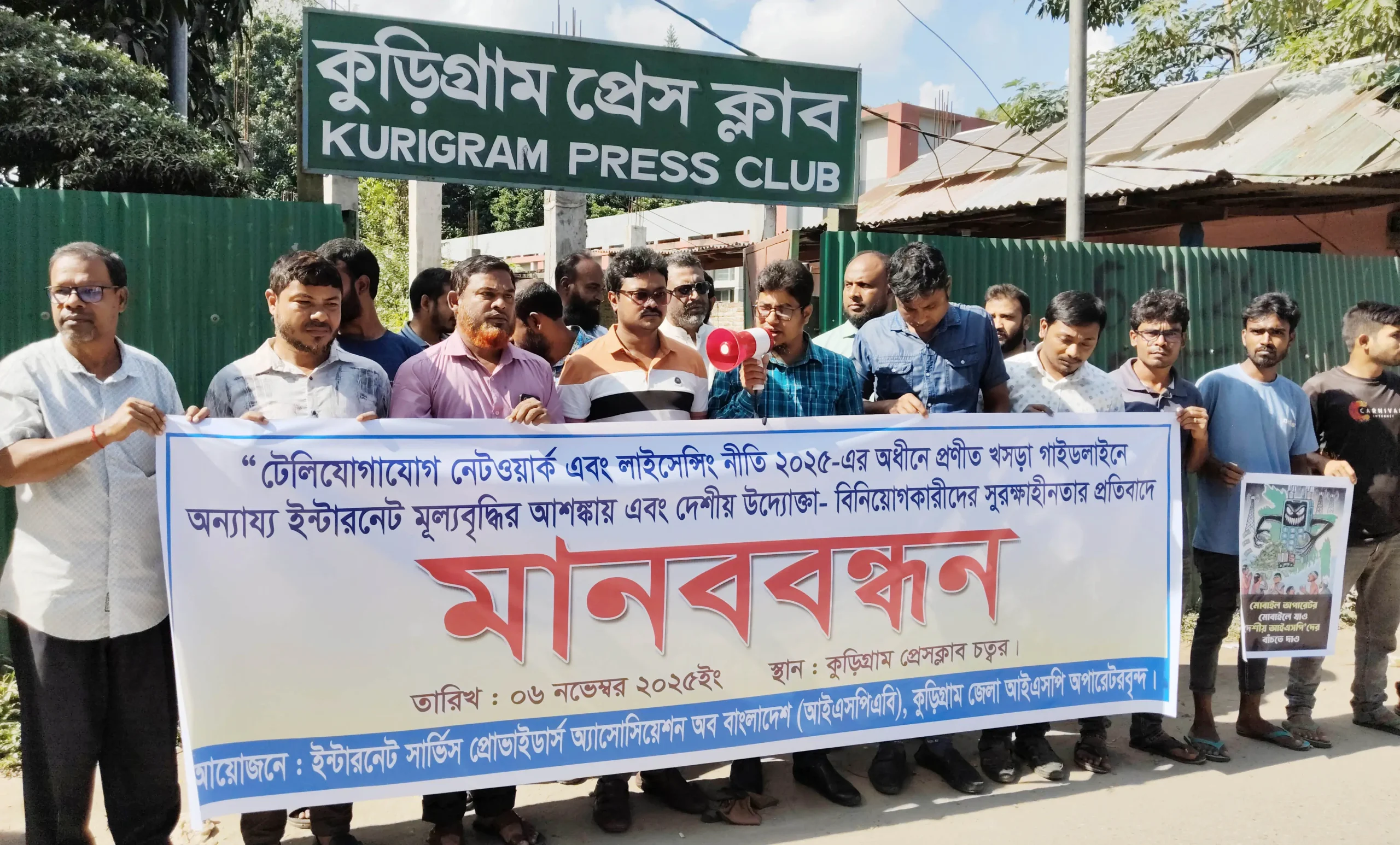 “টেলিযোগাযোগ নেটওয়ার্ক এবং লাইসেন্সিং নীতি ২০২৫”-এর অধীনে প্রণীত খসড়া গাইডলাইনে অন্যায্য ইন্টারনেট মূল্যবৃদ্ধির আশঙ্কা এবং দেশীয় উদ্যোক্তা-বিনিয়োগকারীদের সুরক্ষাহীনতার প্রতিবাদে কুড়িগ্রামে মানববন্ধন অনুষ্ঠিত হয়েছে।