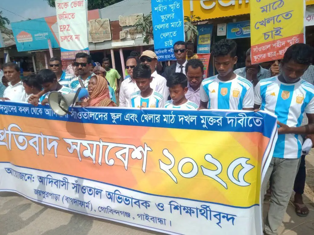 ঘোড়াঘাটে আদিবাসী শহীদ স্মৃতি স্কুল ও ফুটবল খেলার মাঠ দখল করার প্রতিবাদে মানববন্ধন করেছে স্কুল শিক্ষার্থী, অভিভাবকরা