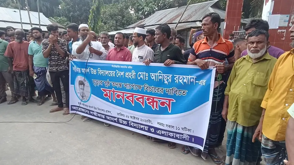 কুড়িগ্রামে আনিছুর রহমান (৩৫) নামে এক নৈশ প্রহরি গত ২০ অক্টোবর স্কুল থেকে নিখোঁজ হন। এরপর ২১অক্টাবর তার মৃতদেহ পাওয়া যায় রংপুরে। রহস্যজনক এ হত্যার সাথে জড়িতদের গ্রেফতারসহ বিচারের দাবিতে রবিবার (২৬ অক্টোবর) দুপুরে বিদ্যালয় মাঠে মানববন্ধন করেছে এলাকার শতশত নারী ও পুরুষ।