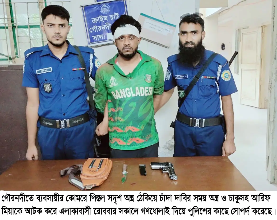বরিশালের গৌরনদীতে প্রকাশ্যে এক ব্যবসায়ীর কোমরে পিস্তল সদৃশ অস্ত্র ঠেকিয়ে ১০ সহস্রাধিক টাকা চাঁদা দাবির সময় আরিফ মিয়া (৩১) নামে এক যুবককে আটক করে এলাকাবাসী গণধোলাই দিয়ে পিস্তল সদৃশ অস্ত্রসহ তাকে (আরিফ) থানা পুলিশের কাছে সোপর্দ করেছে। রোববার সকাল ১০টার দিকে গৌরনদী পৌরসভার আশোকাঠি কাঁচা বাজারে জুয়েল ষ্টোরে চাঁদা দাবির সময় এ ঘটনা ঘটে। আটককৃত আরিফ মিয়া ঢাকা মহানগরীর উত্তরখান থানার চামরখান এলাকার মৃত আক্কাচ আলীর ছেলে ও বরিশালের আগৈলঝাড়া উপজেলার ফুলশ্রী গ্রামের মৃত হাসানাত ফকিরের মেয়ে জামাতা।