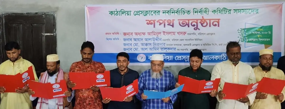 কাঠালিয়া প্রেসক্লাবের সভাকক্ষে ১১ সদস্যের নবনির্বাচিত কার্যনির্বাহী কমিটির সদস্যদের শপথ ভাগ্য পাঠ করান বরিশাল প্রেসক্লাবের সভাপতি আমিনুল ইসলাম খসরু।