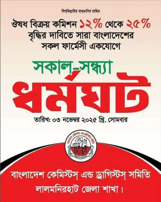 ০৩ নভেম্বর ২০২৫ খ্রি. সোমবার ঔষধ বিক্রয় কমিশন ১২% থেকে ২৫% বৃদ্ধির দাবিতে সারা দেশের মত একযোগে লালমনিরহাটের সকল ফার্মেসী সকাল-সন্ধ্যা ধর্মঘট পালন করবে।