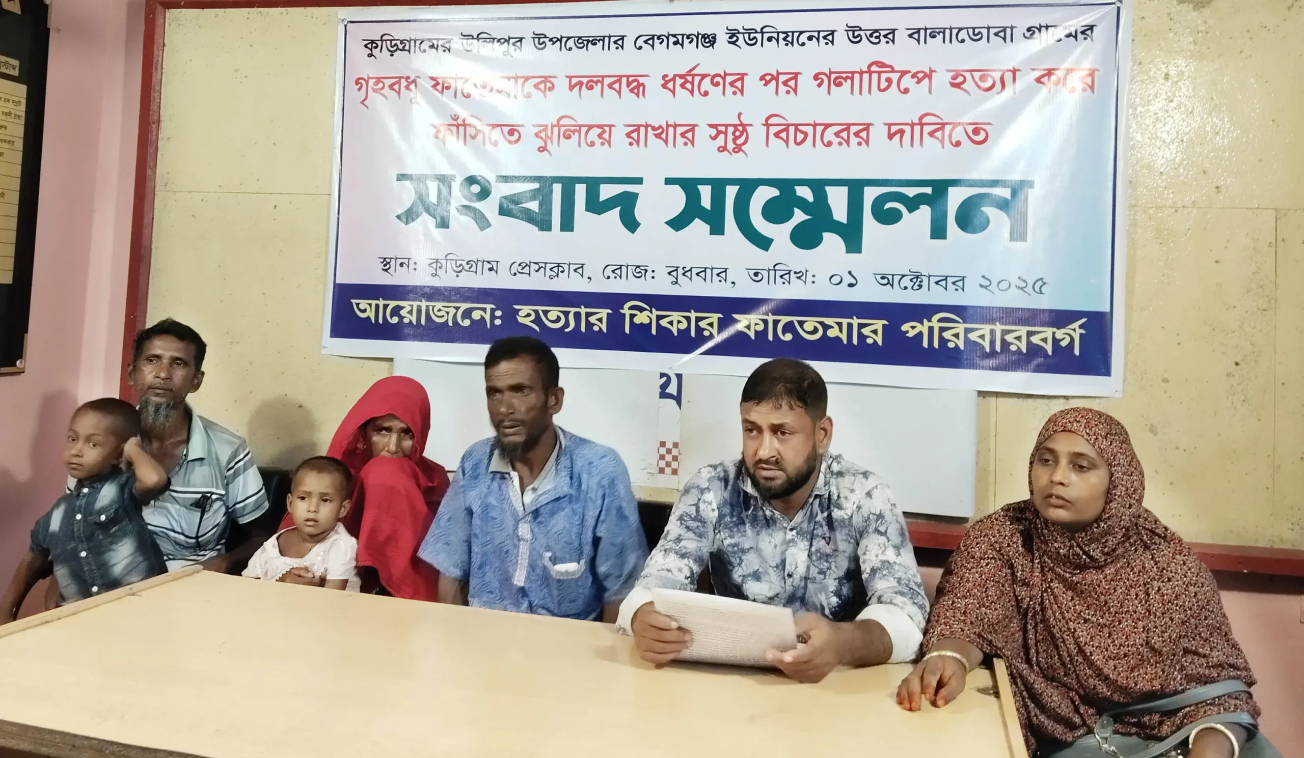 কুড়িগ্রামের উলিপুর উপজেলার বেগমগঞ্জে গৃহবধূ ফাতেমাকে দলবদ্ধ ধর্ষণের পর গলাটিপে হত্যা করে ফাঁসিতে ঝুলিয়ে রাখার অভিযোগ তুলে দৃষ্টান্তমূলক বিচারের দাবিতে সংবাদ সম্মেলন করেছে নিহতের পরিবার। বুধবার (১ অক্টোবর ২০২৫) সকালে কুড়িগ্রাম প্রেস ক্লাবে এ সংবাদ সম্মেলন অনুষ্ঠিত হয়। সংবাদ সম্মেলনে নিহতের স্বজনরা উপস্থিত ছিলেন।