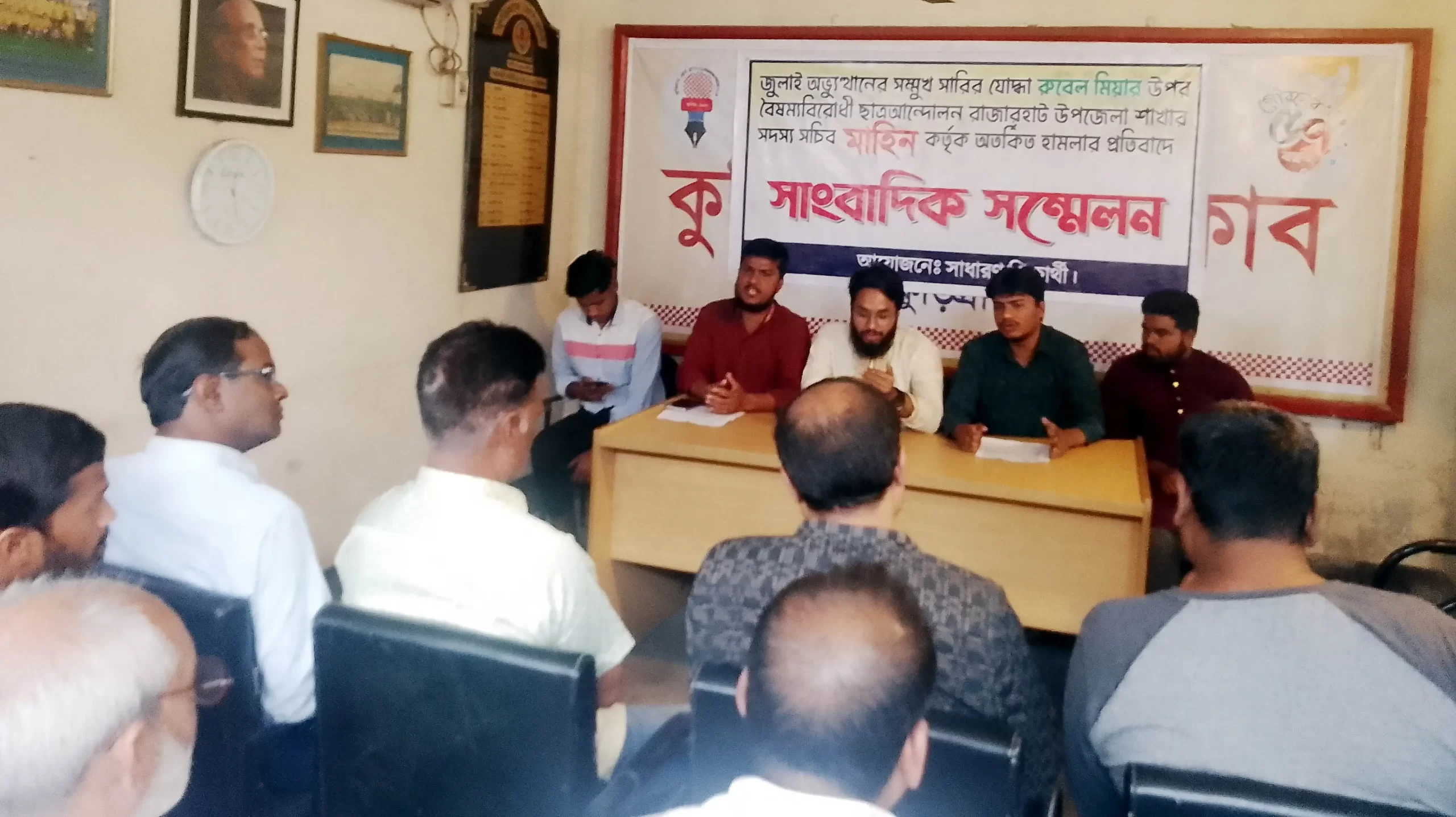 বৈষম্য বিরোধী ছাত্র আন্দোলন রাজারহাট উপজেলা শাখার সদস্য সচিব আল মিজান মাহিন কর্তৃক সাধারণ শিক্ষার্থীর উপর হামলার প্রতিবাদে কুড়িগ্রামে সাংবাদিক সম্মেলন অনুষ্ঠিত হয়েছে।