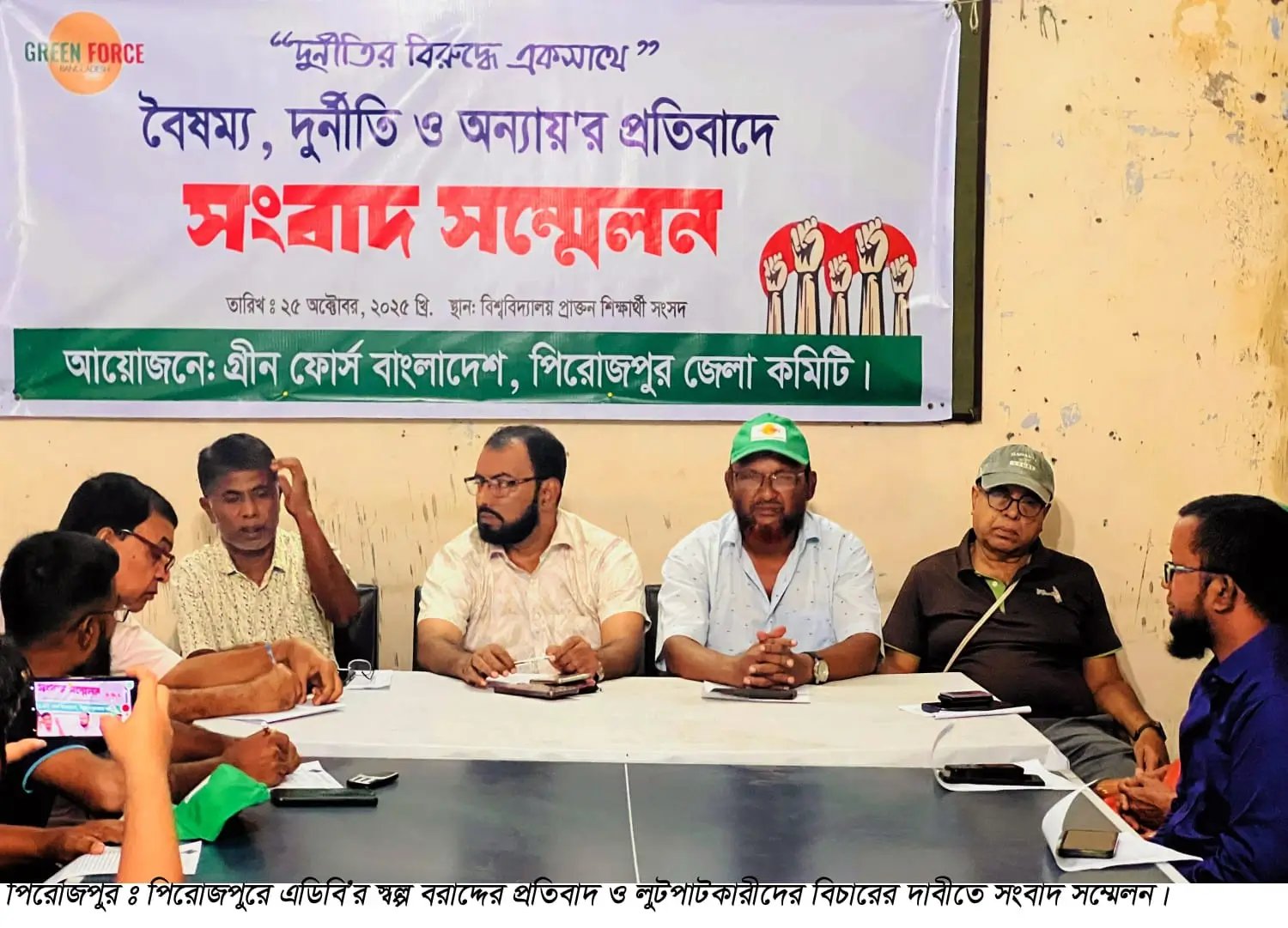 পিরোজপুর জেলায় চলতি আর্থিক বছরে এডিবি’র বরাদ্ধের “বৈষম্য এবং বিগত সময়ে হাজার হাজার কোটি টাকার দুর্নীতি ও লুটপাটের প্রতিবাদে এক সংবাদ সম্মেলন অনুষ্ঠিত হয়েছে। শনিবার (২৫ অক্টোবর) দুর্ণীতি বিরোধী সামাজিক সংগঠন ‘গ্রীন ফোর্স বাংলাদেশ’ পিরোজপুরের উদ্যোগে বিশ্ববিদ্যালয় ক্লাবে সংবাদ সম্মেলন আয়োজন করা হয়। সংবাদ সম্মেলনে সংগঠনটির জেলা সভাপতি মইনুল আহসান মুন্না লিখিত বক্তব্য উপস্থাপন করেন।