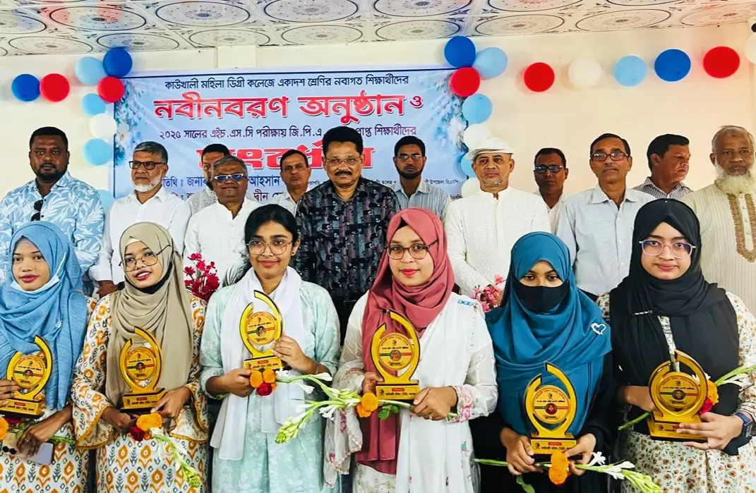পিরোজপুরের কাউখালী মহিলা ডিগ্রী কলেজের আয়োজনে, রবিবার (৯ অক্টোবর) সকাল সাড়ে দশটায় কলেজের হলরুমে মহিলা ডিগ্রী কলেজে একাদশ শ্রেণীর নবাগত শিক্ষার্থীদের নবীন বরণ ও ২০২৫ সালে অনুষ্ঠিত এইচএসসি পরীক্ষায় জিপিএ ফাইভ প্রাপ্ত শিক্ষার্থীদের সংবর্ধনা দেওয়া হয়।